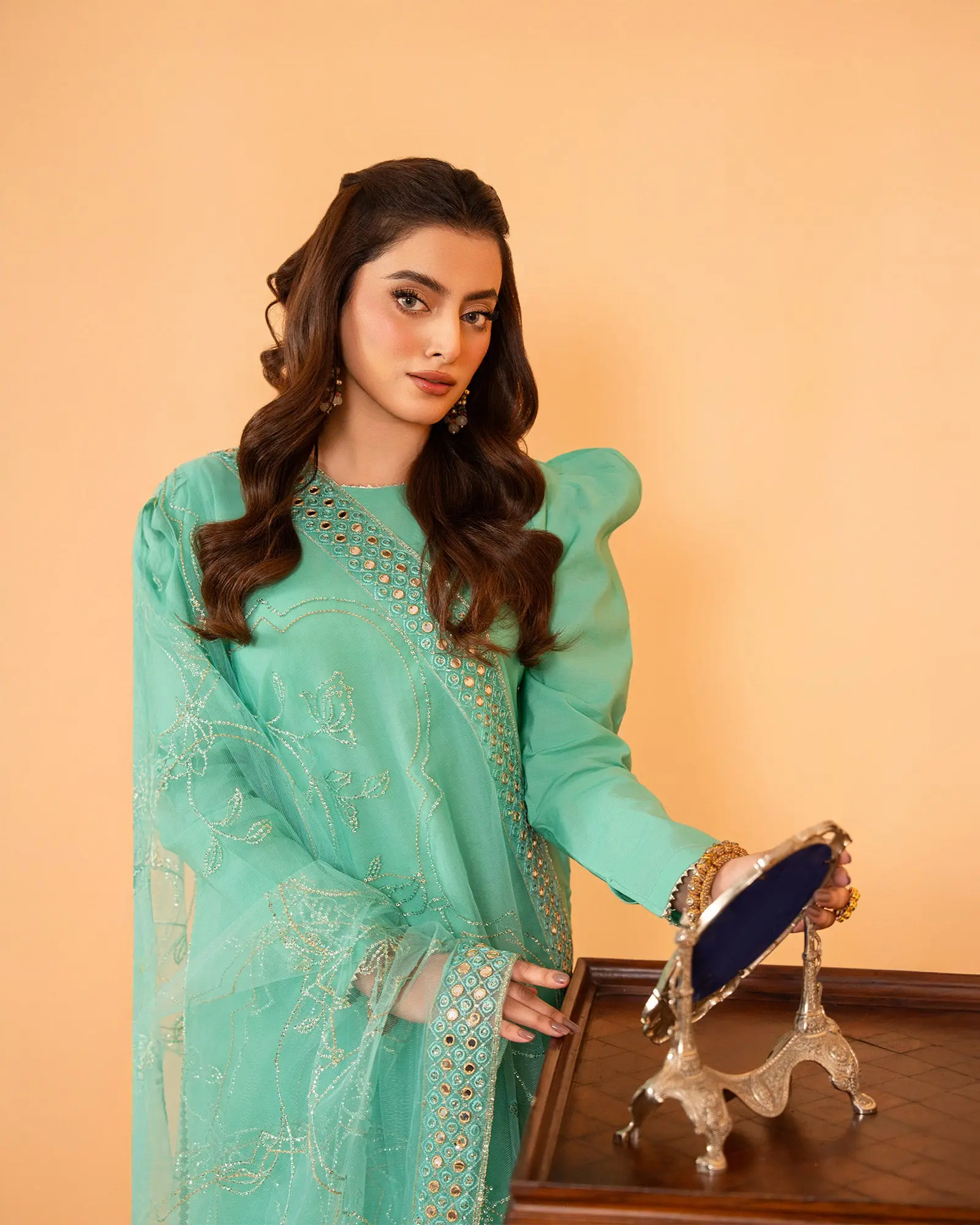 This wedding season style up with these vibrant and classy attires, adorned with bold combination of hues Solid katan shalwar kameez paired with a net dupatta with sequence and threadwork detailing will give you a complete pleasing look at any formal event.