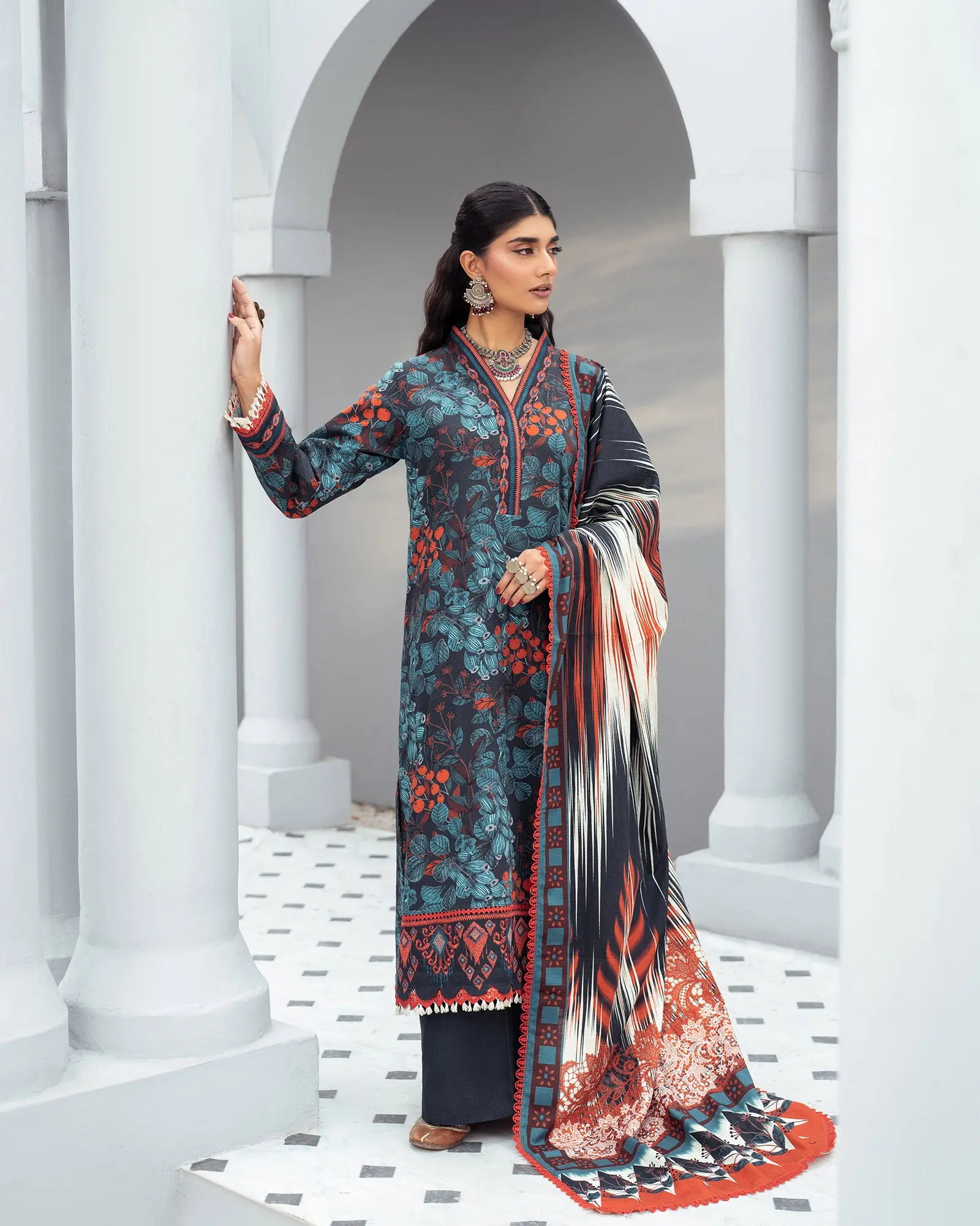 This timeless 3-piece khaddar outfit blends traditional charm with modern refinement. The intricately colorful embroidered shirt, enhanced with motifs and lace accents, pairs beautifully with solid trousers and a soft printed shawl for a look steeped in cultural elegance.