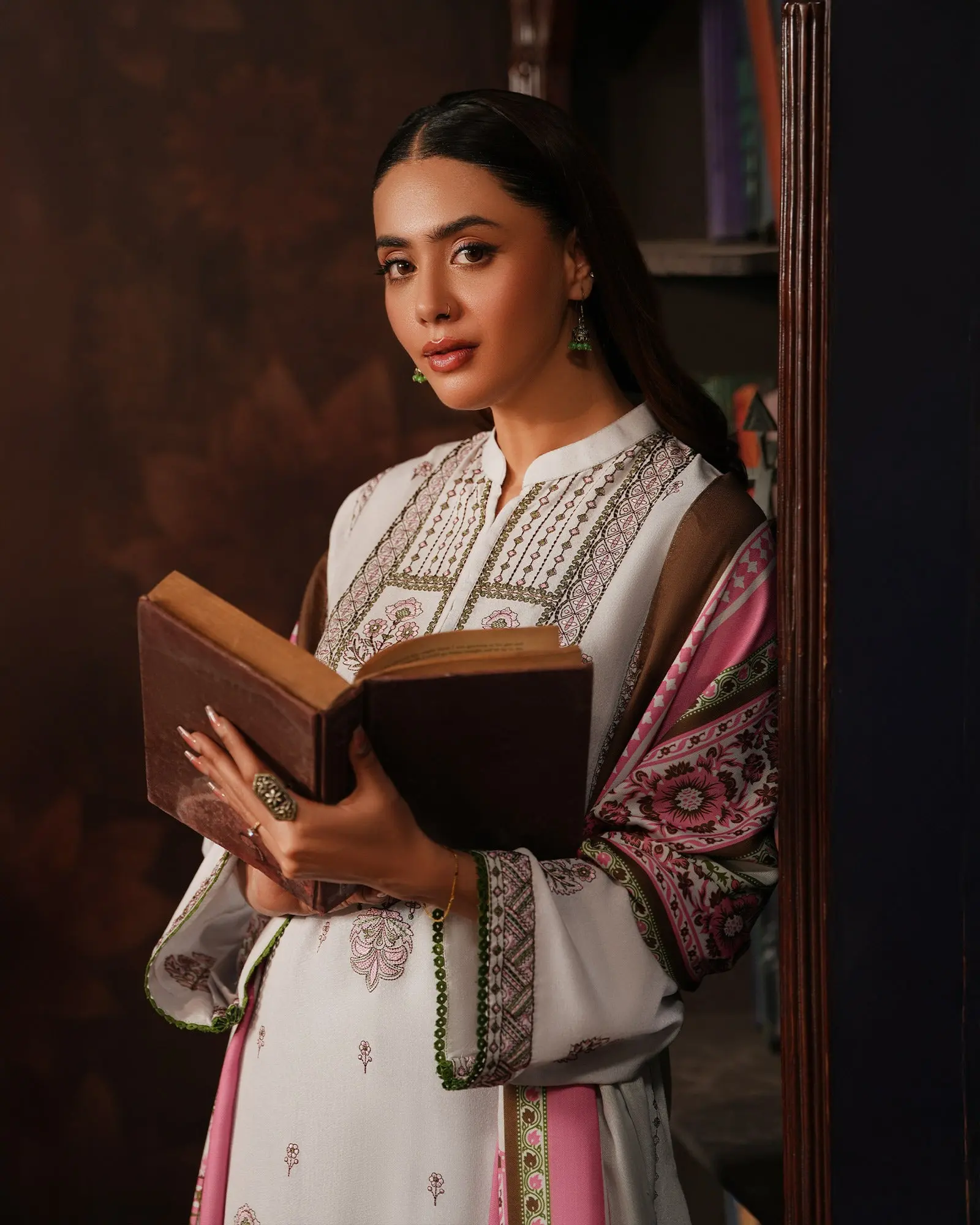 A stunning blend of tradition and charm, this 3-piece karandi linen suit showcases a straight-cut shirt with delicate embroidery and statement finishings. Completed with trousers and a printed wool shawl, it's your go-to look for effortlessly graceful occasions.