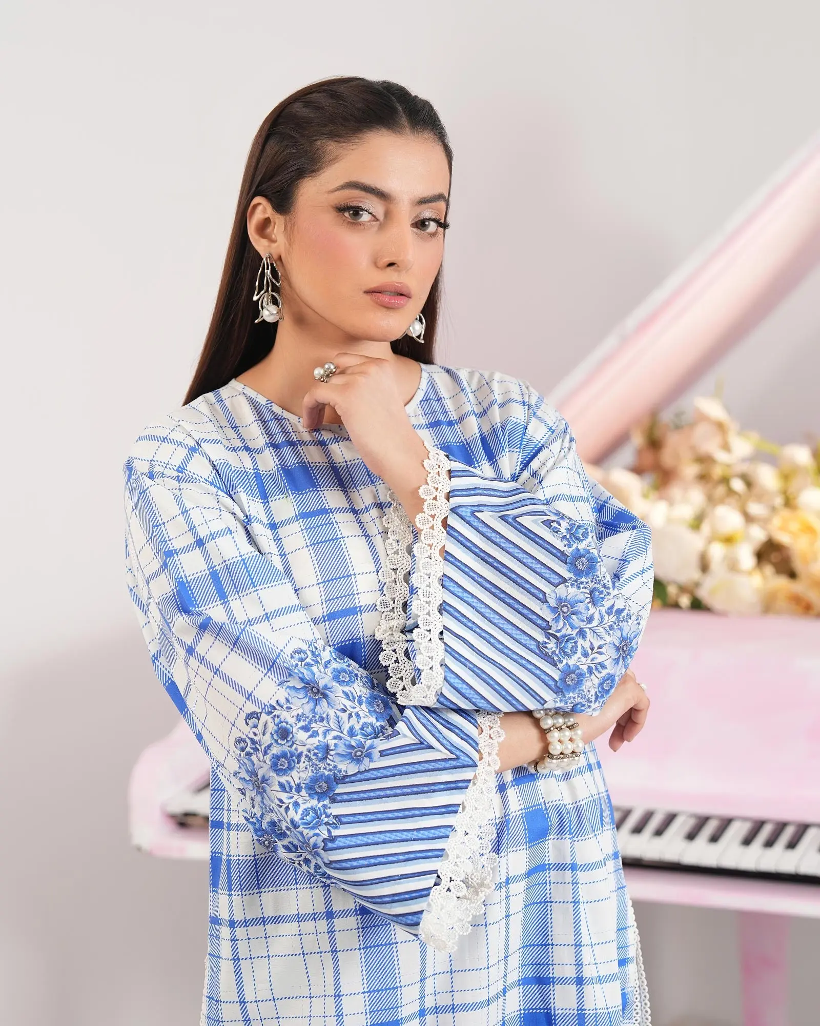 (Laces and embellishments are not included with unstitched articles.)