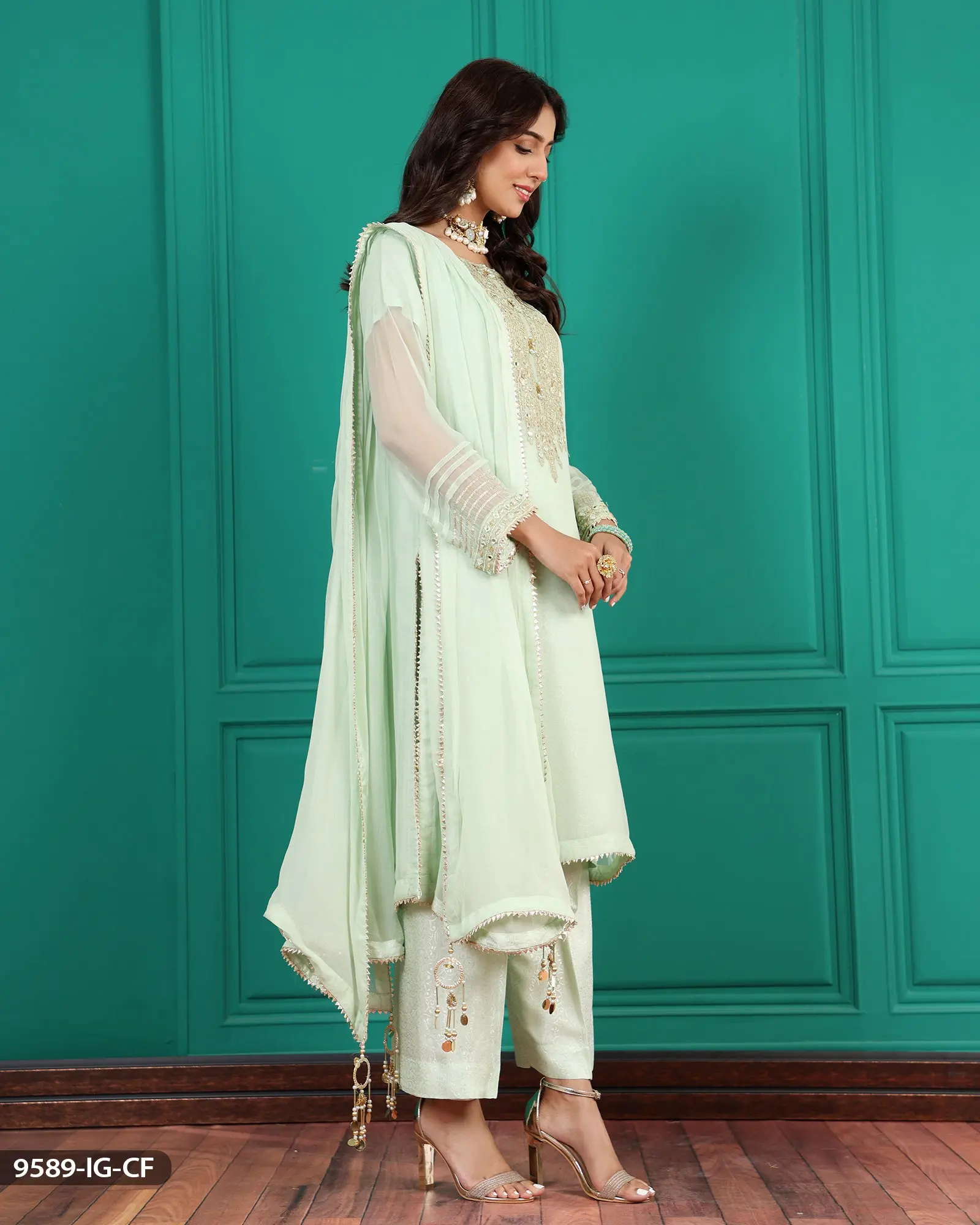 You can never go wrong with pastel hues especially ones that come in this gorgeous three piece ensemble. The chiffon shirt is gorgeously filled with tilla embroidery and donned with sequences, shisha work, gota detailing and beads embellishment. Paired with a jacquard viscose trouser and a crinkle chiffon dupatta this look embraces the true essence of looking sophisticated.