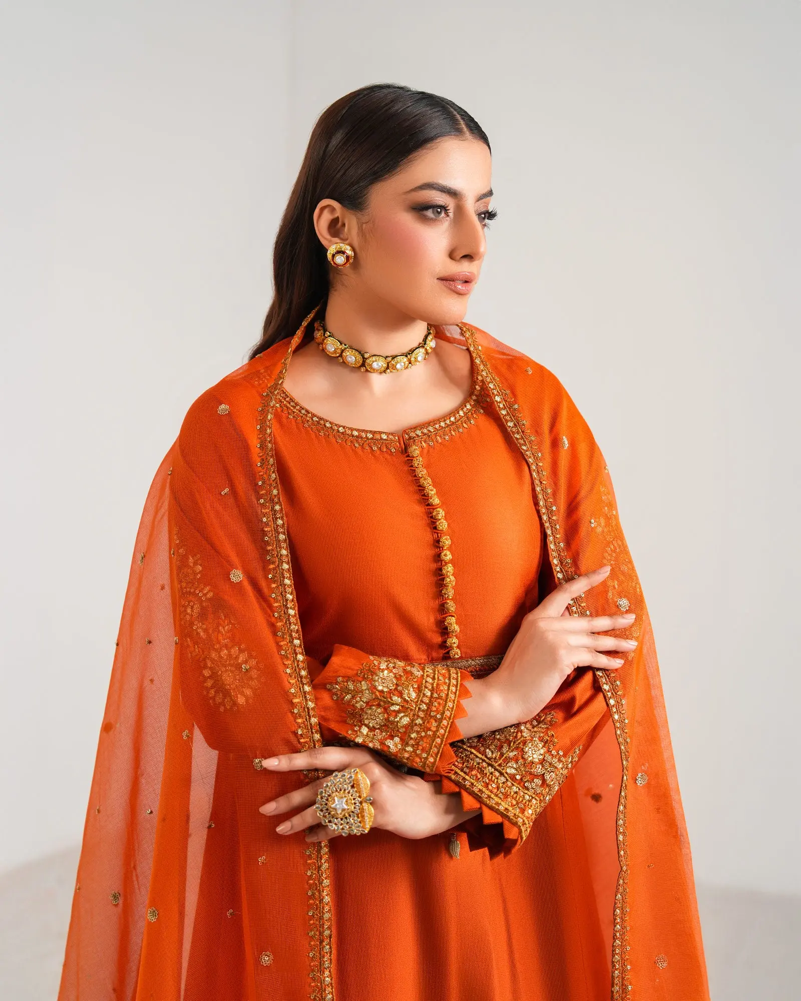 Versatile Sophistication, Discover a new level of elegance with our dynamic 3-piece chambray katan frock. Featuring a modern-style bodice embellished with detailed bise-cut flare frock with fine embroidery and bordered lace, this outfit exudes luxury and finesse. The combination of breezy Chambray Katan trousers and a chic heavy organza net dupatta makes it the ideal choice for those who navigate both corporate environments and social celebrations with style.