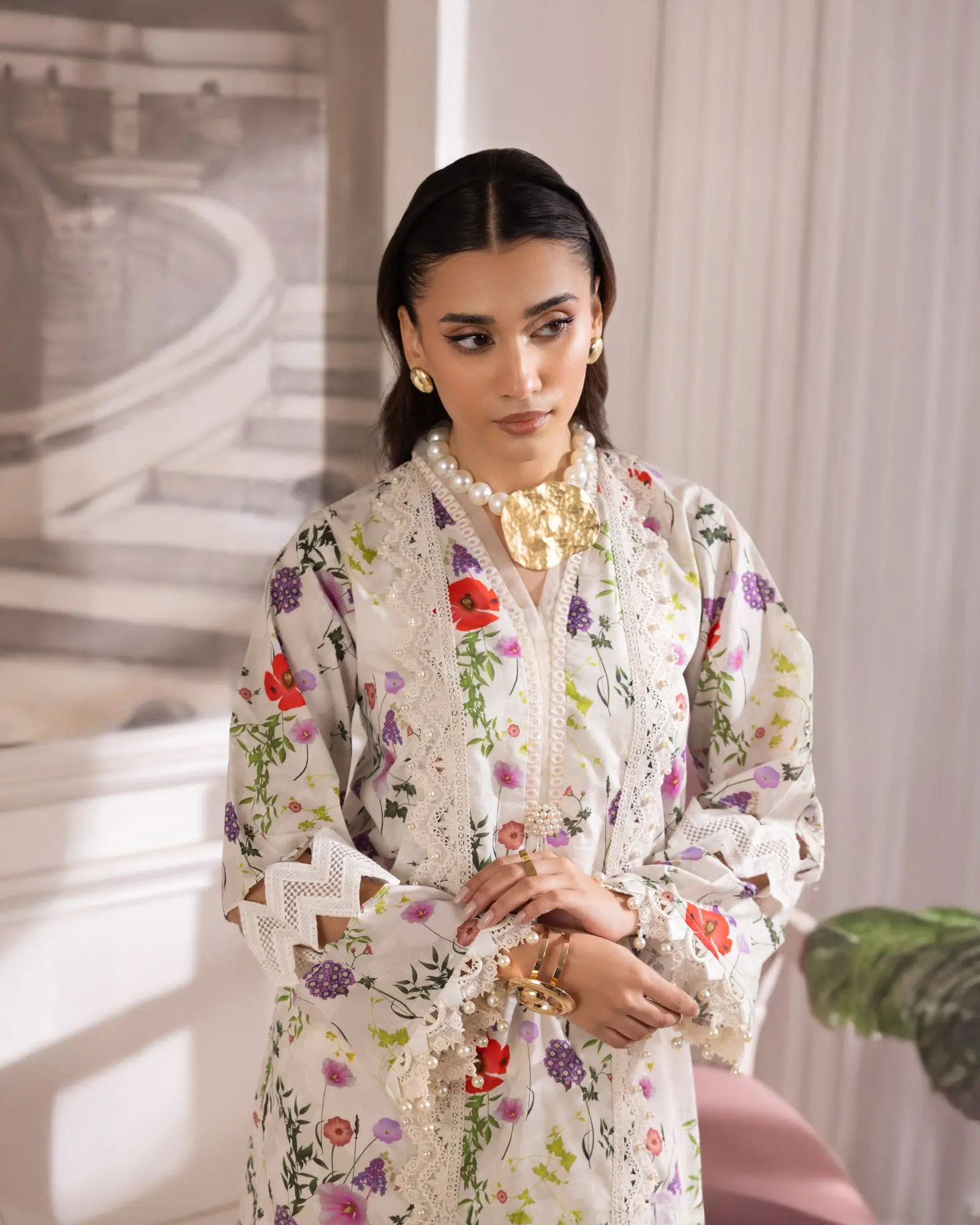 Breezy elegance for hot days! This classy cotton 3-piece ensemble, adorned with intricate lace and brads work details and a lace-trimmed border, is your go-to summer essential. Complete with matching solid palazzo and a bold printed dupatta, itβs the perfect mix of grace and ease.