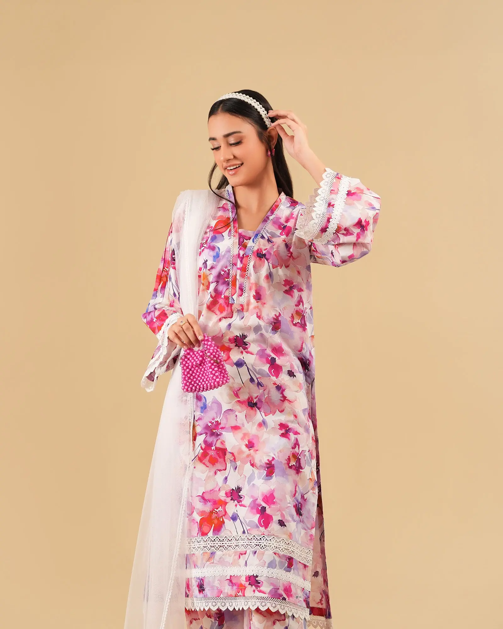 Refresh your Sunny Sophistication look with this printed 3-piece outfit that combines contemporary design with lively prints, paired with the same printed trousers and net dupatta. Designed for comfort and style, this ensemble is ideal for embracing the warmth and energy of summer in effortless fashion.