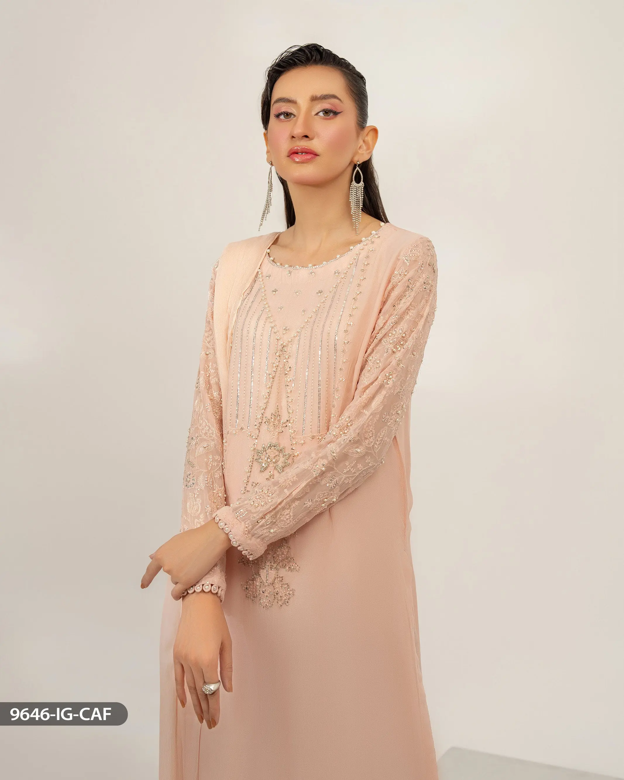 This luxury classy attire suits your preference, a long shirt featuring with boat neckline, pearls details, and heavy adda work on the neckline and sleeves embellished with sequence, Tilla, pearls, cut dans, and fine thread embroidery, dangling tassels on hem with pleats border, topped with crinkle chiffon dupatta with tassels on borders paired with pants always top priority for your formal events.