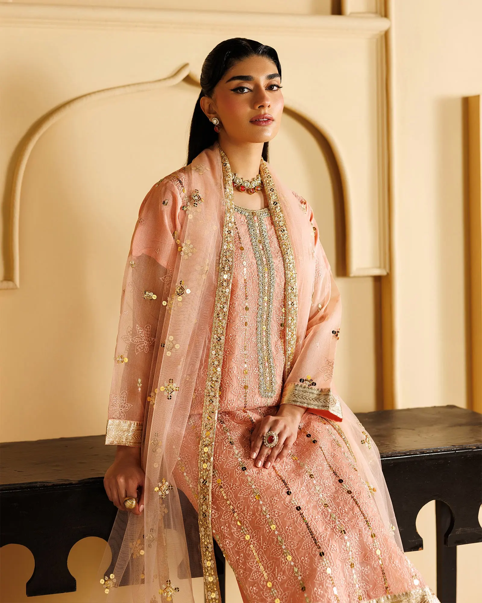 A celebration of craftsmanship and charm—this embroidered kameez with sequins, tilla work, lace, and embroidery base detailing flows beautifully with raw silk trousers and a heavily adorned dupatta, creating a look that’s effortlessly captivating.