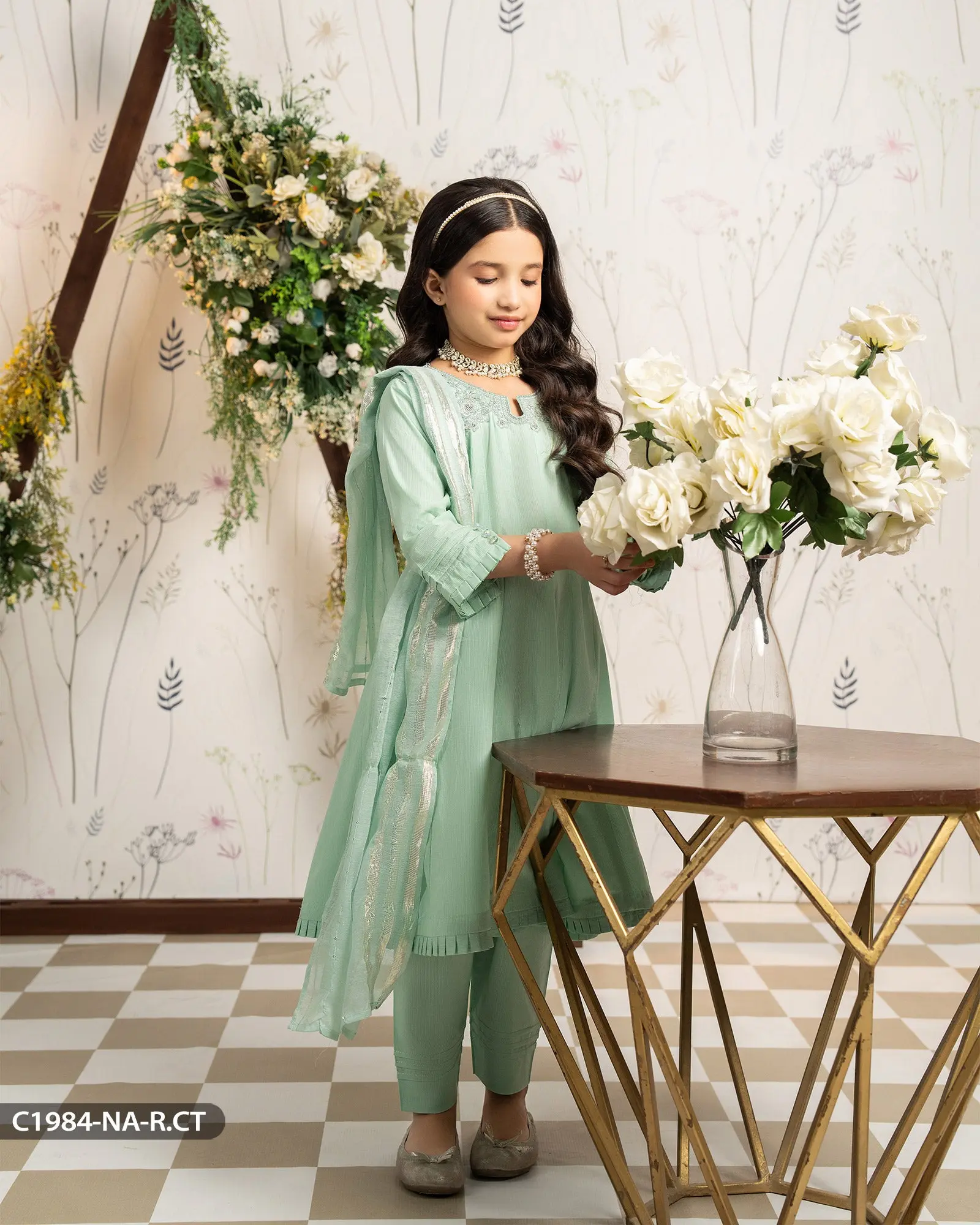 This 3pc long frock is a contemporary blend with the traditional look. The cotton frock style shirt is beautifully crafted with a signature neckline embellished with tilla, thread, beads, and pleats details, topped with a monarch dupatta with sequence details and straight pants, this look is a true look for modern kids.
