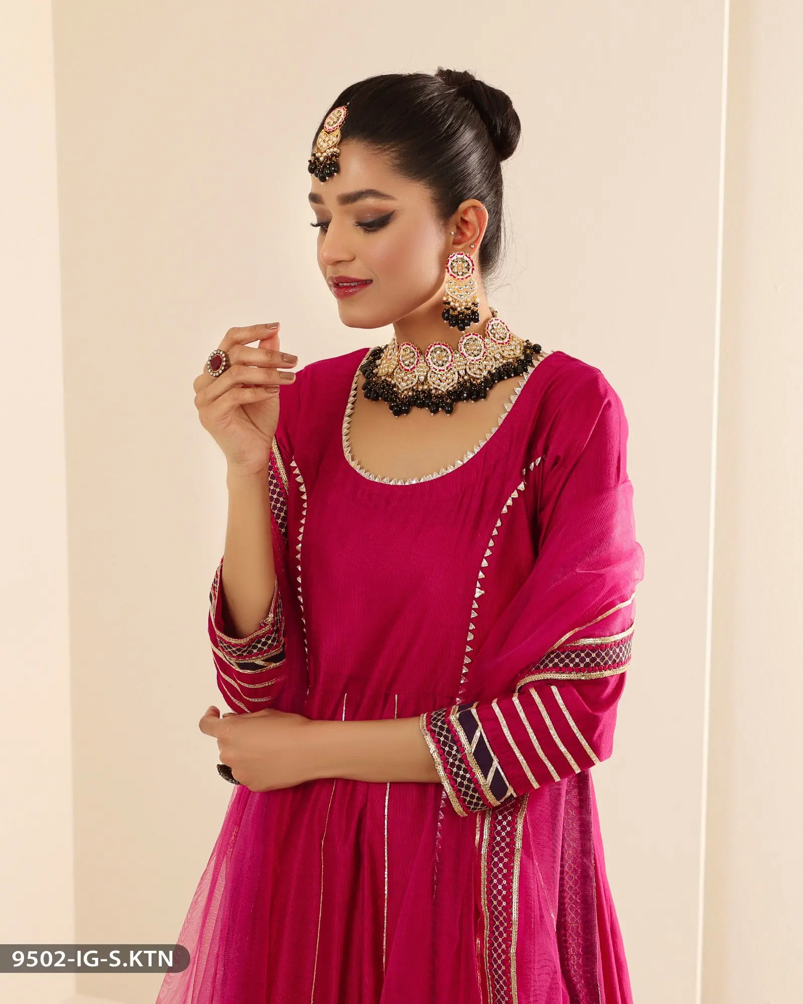 Encapsulate the spirit of festivities in this mesmerizing maxi style three piece ensemble in a deep shade of pink. The chambray katan shirt features intricate tilla embroidery donned with sequences, tassels and gota work. paired with a chambray katan trouser and a net dupatta with exquisite borders this look is perfect for this season’s festive occasions.