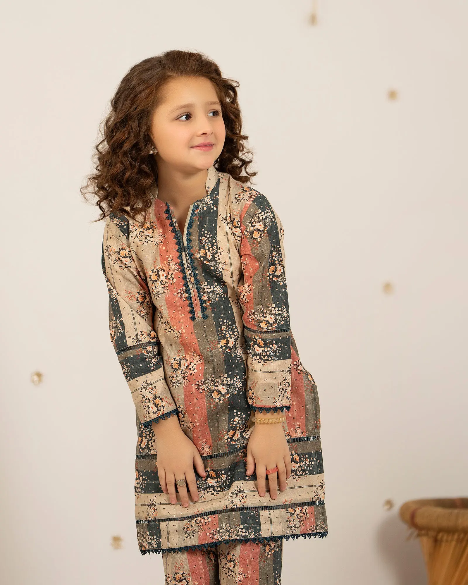 Step into winter sophistication with this elegant kids' khaddar 3-piece. The printed shirt features vivid prints with lace finishing, paired seamlessly with trousers for a polished seasonal look.
