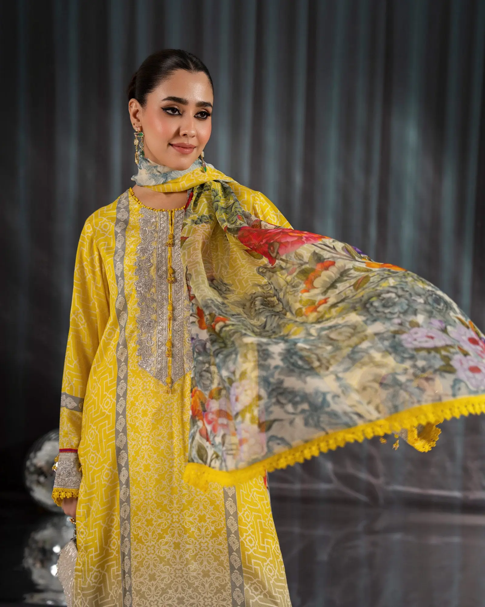 Slay in this bold 3-piece raw silk attire. It comes with a long shirt with a printed base, adorned with tilla, lace, and beadwork, with classical detailing, paired with culottes topped with a printed chiffon duppata, giving a classical, everlasting look.
